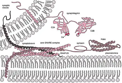 Molecular machinery driving exocytosis in neuromediator release. The core SNARE complex is formed by four α-helices contributed by synaptobrevin, syntaxin and SNAP-25, synaptotagmin serves as a calcium sensor and regulates intimately the SNARE zipping.[11]