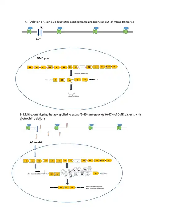 Dystrophin can maintain a large degree of functionality so long as the essential terminal domains are unaffected, and exon skipping only occurs within the central rod domain. Given these parameters, exon skipping can be used to restore an open reading frame by inducing a deletion of one or several exons within the central rod domain, and thus converting a DMD phenotype into a BMD phenotype.
