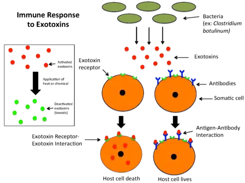 This figure shows that exotoxins are secreted by bacterial cells, Clostridium botulinum for example, and are toxic to somatic cells. Somatic cells have antibodies on the cell wall to target exotoxins and bind to them, preventing the invasion of somatic cells. The binding of the exotoxin and antibody forms an antigen-antibody interaction and the exotoxins are targeted for destruction by the immune system. If this interaction does not happen, the exotoxins bind to the exotoxin receptors that are on the cell surface and causes death of the host cell by inhibiting protein synthesis. This figure also shows that the application of heat or chemicals to exotoxins can result in the deactivation of exotoxins. The deactivated exotoxins are called toxoids and they are not harmful to somatic cells.