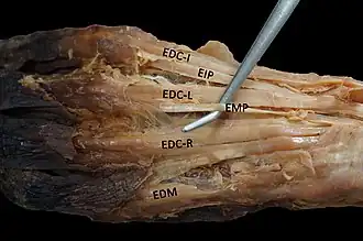 - ↑ von Schroeder, H. P.; Botte, M. J. (November 1991). "The extensor medii proprius and anomalous extensor tendons to the long finger". The Journal of Hand Surgery. 16 (6): 1141–1145. doi:10.1016/s0363-5023(10)80081-4. ISSN 0363-5023. PMID 1748763.
