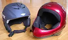 | A photo of a ski helmet and a motorcycle helmet, types of headwear that can cause external-compression headaches if worn tighthly for long periods | |