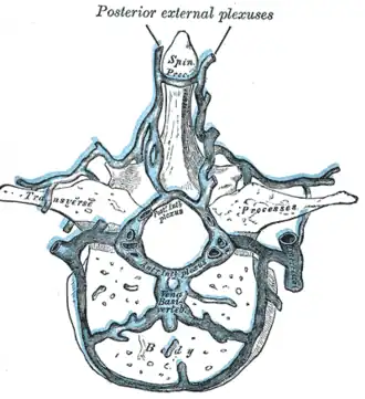 ![]() Transverse section of a thoracic vertebra, showing the vertebral venous plexuses. | |