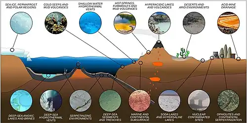 | Acidic systems | Volcanic springs, acid mine drainage | pH 0.06 to 1.0[21] | Picrophilus oshimae, Thermoplasma acidophilum, other species |