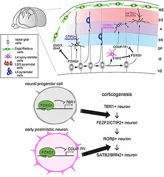 The onset of FOXG1 expression in progenitor cells ends the production of the earliest born neurons, in other words, Cajal-Retzius cells, through direct suppression of a major transcriptional network. This network comprises, as shown by transcriptome analysis and FOXG1-ChIP sequencing, TBR1, DMRTA1, EBF2, and EBF3.[32][28][33]