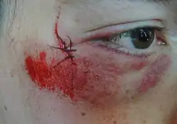 Injury mechanisms such as falls, assaults, sports injuries, and vehicle crashes are common causes of facial trauma in children[6][4] as well as adults.[7] Blunt assaults, blows from fists or objects, are a common cause of facial injury.[8][1] Facial trauma can also result from wartime injuries such as gunshots and blasts. Animal attacks and work-related injuries such as industrial accidents are other causes.[9] Vehicular trauma is one of the leading causes of facial injuries. Trauma commonly occurs when the face strikes a part of the vehicle's interior, such as the steering wheel.[10] In addition, airbags can cause corneal abrasions and lacerations (cuts) to the face when they deploy.[10]