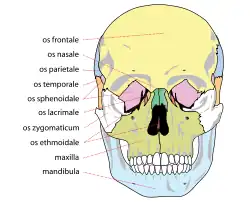 Commonly injured facial bones include the nasal bone (the nose), the maxilla (the bone that forms the upper jaw), and the mandible (the lower jaw). The mandible may be fractured at its symphysis, body, angle, ramus, and condyle.[4] The zygoma (cheekbone) and the frontal bone (forehead) are other sites for fractures.[13] Fractures may also occur in the bones of the palate and those that come together to form the orbit of the eye.