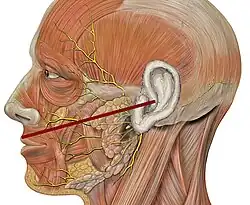 Diagram of lateral view of face showing the imaginary line between the tragus of the ear and the middle of the upper lip. The middle third of this line is the approximate location of the course of the parotid duct. If facial lacerations cross this line, there is a risk that the parotid duct is damaged.