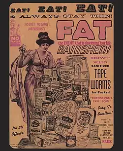 The 19th century also saw the first and one of the most dangerous fad diet pills, with the marketing of arsenic pills for weight loss, which not only did not work, but which dieters often consumed more quantity than the prescribed dosage. Some diet hoaxes also appeared, such as the tapeworms diet, where the dieters would purportedly willfully ingest tapeworms in the hopes they would reach maturity in the intestines and absorb food, until the dieter attains the weight loss goal and consumes an anti-parasitic pill to kill and hopefully excrete the worms, if the dieter was lucky enough to not experience gastric obstruction.[18][53]