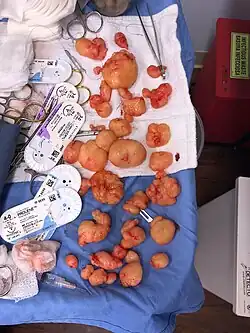 The only effective treatments for lipomas caused by familial multiple lipomatosis are liposuction or surgical removal.[6] Steroid injections may also be used to shrink the tumors by causing local fat atrophy.[7] Patients with the condition often seek removal when the lipomas are large, disfiguring, or cause pain.[2] This may be done by a dermatologist or other surgeon. In the majority of cases where one to a few subcutaneous lipomas are being excised, the procedure is done under local anaesthetic and the patient can resume most normal activities immediately afterward.[6] Over-the-counter pain medications are generally sufficient in the following days and long-term scarring is minimal.[6] Regrowth is rare because lipomas are usually well-encapsulated and are therefore removed entirely although more new lipomas may start to grow in the same area.[7]