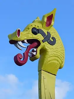 The iconographic representation of some Hindu deities include fangs, to symbolize the ability to hunt and kill. Two examples are fierce warrior goddess Chamunda and god of death Yama in some iconographic representations. Fangs are also common among guardian figures such as Verupaksha in Buddhism art in China and East Asia,[4] as well as Rangda in Balinese Hinduism.[5]