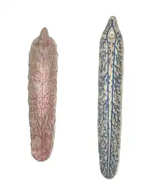 | Cobbold's drawings of dorsal (left) and ventral views of Fasciola gigantica | |