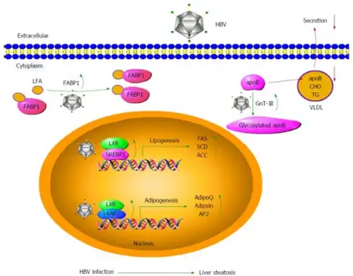 {{cite journal}}: CS1 maint: unflagged free DOI (link)Recently, accumulating evidence from experimental investigations has suggested that HBV infection is a potential trigger of liver steatosis. HBx can induce hepatic steatosis at all aspects, such as increasing fatty acid binding, promoting lipid synthesis and inhibiting secretion of apolipoprotein - ↑ Goldman, Lee (2003). Cecil Textbook of Medicine – 2-Volume Set, Text with Continually Updated Online Reference. Philadelphia: W.B. Saunders Company. ISBN 978-0-7216-4563-6.