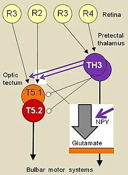 As explained above, the optic tectum is responsible for the orienting and snapping responses in prey-catching behavior; however, Ewert's research also revealed that focal electrical stimulation of the thalamic and pretectal brain regions evoked different kinds of avoidance behaviors in the toad.[17] Feature detectors were also observed in these brain regions. Neurons were observed to be either directionally-sensitive to looming large objects, size-selective or perceptive to stationary obstacles. Certain pretectal thalamic neurons, type TH3, showed a preference for big moving objects and the anti-worm configuration of moving bar stimuli.[18] It is suggested that the selectivity of tectal prey feature detectors, type T5.2, is determined by inhibitory influences of pretectal anti-worm detectors of the type TH3. Pretectal lesions impaired the prey-selectivity.[16]