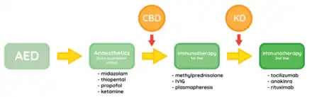The seizures are often resistant to treatment.[3] High doses of benzodiazepines or barbiturates are often used, with care taking place in the intensive care unit.[3] A ketogenic diet may help in some cases.[2] The medications anakinra or tocilizumab have been tried.[3] The risk of death, despite treatment is about 12%.[3]