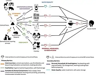 The sanitation and hygiene barriers when placed correctly prevent the transmission of an infection through hands, water and food. The F-diagram can be used to show how proper sanitation (in particular toilets, hygiene, handwashing) can act as an effective barrier to stop transmission of diseases via fecal–oral pathways.