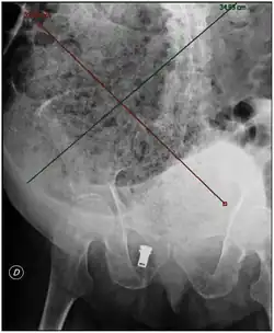 Distal or sigmoid, fecalomas can often be disimpacted digitally or by a catheter which carries a flow of disimpaction fluid (water or other solvent or lubricant). Surgical intervention in the form of sigmoid colectomy[13] or proctocolectomy and ileostomy[14] may be required only when all conservative measures of evacuation fail. Attempts at removal can have severe and even lethal effects, such as the rupture of the colon wall by catheter or an acute angle of the fecaloma (stercoral perforation), followed by sepsis. It may also lead to stercoral perforation, a condition characterized by bowel perforation due to pressure necrosis from a fecal mass or fecaloma.[15][16]