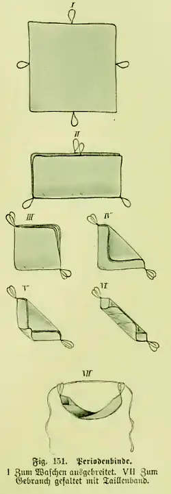 It is likely that pieces of cloth or special rags were used to collect the menstrual fluid. However, there are few records of menstrual pads from the pre-industrial era.[40] As artifacts, the various types of menstrual pads have not been preserved or survived in any particular sense, as the cloths used were discarded when they became worn out or the need for them ceased with menopause. However, as technology evolved, commercial hygiene products were introduced in the form of the menstrual pad, also known as the sanitary napkin. In Sweden, this happened at the end of the 19th century and has been linked to an increased focus on cleanliness, personal hygiene and health that occurred in the early part of the 20th century in the wake of urbanization.[41] By the end of the 19th century, the first commercial sanitary napkin had also been introduced on the American market by Johnson & Johnson. It was a variant of the menstrual pad made of flannel.[42]