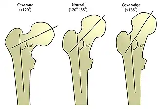 The angle is widest in infancy, and becomes lessened during growth, so that at puberty it forms a gentle curve from the axis of the body of the bone. In the adult, the neck forms an angle of about 125° with the body, but this varies in inverse proportion to the development of the pelvis and the stature. The angle decreases during the period of growth, but after full growth has been attained it does not usually undergo any change, even in old age; it varies considerably in different persons of the same age. Coxa vara is a deformity of the hip, whereby the angle between the head and the shaft of the femur is reduced to less than 120 degrees. Its opposite is coxa valga.