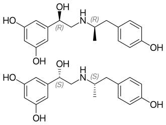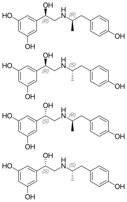 5-(1-Hydroxy-2-{[2-(4-hydroxyphenyl)-1-methylethyl]amino}ethyl)benzene-1,3-diol is a molecule with two different stereogenic centers. Thus, four stereoisomers may exist, the (R,R)-, (R,S)-, (S,R)- and (S,S)-stereoisomers (see the figure below). Fenoterol is a racemate of the (R,R)- and the (S,S)-enantiomers. This racemate is 9 to 20 times more effective, as compared to the racemate of the (R,S)- and (S,R)-enantiomers.[14]