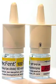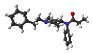 - ↑ Vardanyan RS, Hruby VJ (March 2014). "Fentanyl-related compounds and derivatives: current status and future prospects for pharmaceutical applications". Future Medicinal Chemistry. 6 (4): 385–412. doi:10.4155/fmc.13.215. PMC 4137794. PMID 24635521.