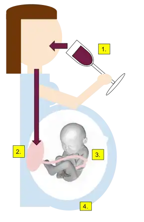 Fetal alcohol spectrum disorders are caused by a mother drinking alcohol during pregnancy.[1] Surveys from the United States found that about 10% of pregnant women drank alcohol in the past month, and 20% to 30% drank at some point during the pregnancy.[10] About 3.6% of pregnant American women are alcoholics.[11] The risk of FASD depends on the amount consumed and the frequency of consumption as well as at what point in pregnancy the alcohol was consumed.[10] Other risk factors include older age of the mother, smoking, and poor diet.[12][10] There is no known safe amount or time to drink alcohol during pregnancy.[1][13] While drinking small amounts does not cause abnormalities in the face, it may cause behavioral issues.[11] Alcohol crosses the blood–brain barrier and both directly and indirectly affects a developing baby.[14] Diagnosis is based on the signs and symptoms in the person.[1]