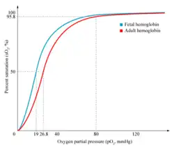 For reference, the P50 of fetal hemoglobin is roughly 19 mmHg (a measure of pressure), whereas adult hemoglobin is approximately 26.8 mmHg (see Blood gas tension).[18]