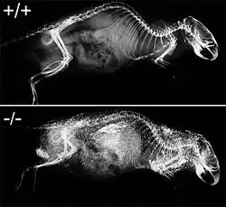 The function of Fetuin-A in the body was determined by gene knockout technology in mice. Knocking out the gene for fetuin-A rendered the mice completely fetuin-A deficient. Feeding a mineral-rich diet to fetuin-A-deficient mice resulted in widespread calcification (ectopic mineralization) of lung, heart, and kidneys in these mice. The calcification became drastically exacerbated when the fetuin-A knockout was combined with the genetic background DBA/2. The mouse strain DBA/2 is known for its proneness to calcify damaged tissues, a process called "dystrophic calcification". Fetuin-A deficiency dramatically increased the calcification proneness of these mice in that all mice spontaneously calcified throughout their body even without a mineral-rich diet or surgical tissue trauma. Fetuin-A is therefore regarded as a potent inhibitor of systemic calcification.