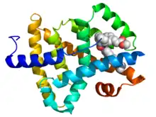 - 1 2 PDB: 1OSH; Downes M, Verdecia MA, Roecker AJ, Hughes R, Hogenesch JB, Kast-Woelbern HR, Bowman ME, Ferrer JL, Anisfeld AM, Edwards PA, Rosenfeld JM, Alvarez JG, Noel JP, Nicolaou KC, Evans RM (April 2003). "A chemical, genetic, and structural analysis of the nuclear bile acid receptor FXR". Mol. Cell. 11 (4): 1079–92. doi:10.1016/S1097-2765(03)00104-7. PMC 6179153. PMID 12718892.