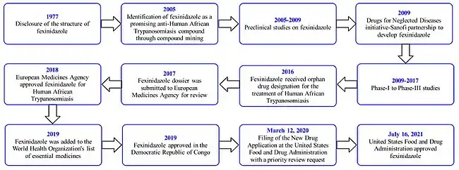 Fexinidazole was first described in 1978.[6] It was given a positive opinion by the European Medicines Agency in 2018 and approved for medical use in the United States in 2021.[2][7] It is on the World Health Organization's List of Essential Medicines.[8] Development for sleeping sickness was funded by the Drugs for Neglected Diseases initiative in collaboration with Sanofi.[9]
