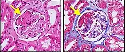 - ↑ This figure illustrates that Masson's trichrome stain also helps to distinguish between fibrinoid necrosis, and sclerosis in renal biopsies.