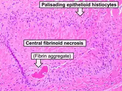 - Sarcoidosis: Fibrinoid necrosis may be observed in the central region of sarcoid granulomas, providing a histopathological distinction from the caseous necrosis characteristic of granulomas in tuberculosis.[26]