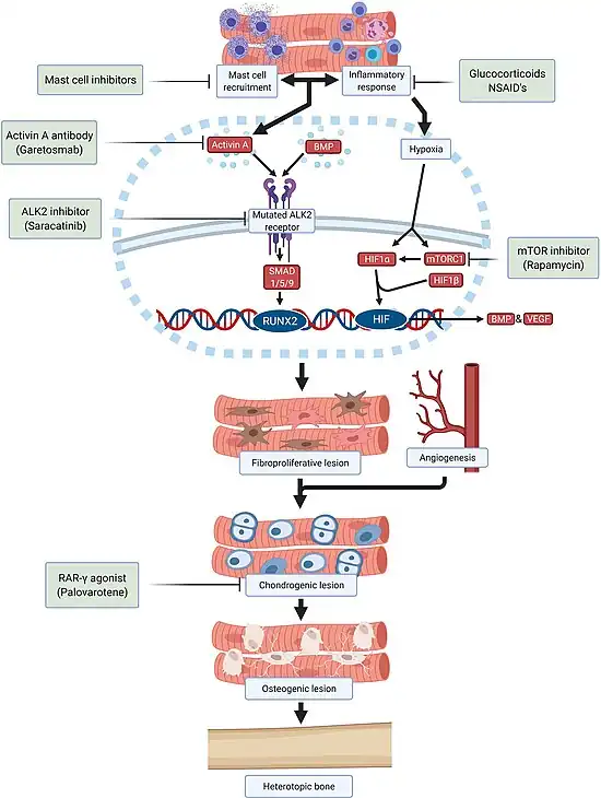 A mutation in the gene ACVR1 (also known as activin-like kinase 2 (ALK2)) is responsible for the disease.[8] ACVR1 encodes activin receptor type-1, a BMP type-1 receptor. The mutation causes substitution of codon 206 from arginine to histidine in the ACVR1 protein.[9][10] This substitution causes abnormal activation of ACVR1, leading to the transformation of connective tissue and muscle tissue into a secondary skeleton. This causes endothelial cells to transform to mesenchymal stem cells and then to bone.[11]