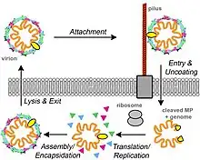 Entry into the host cell is achieved by adsorption into the host cell. Replication follows the positive-strand RNA virus replication model. Positive-strand RNA virus transcription is the method of transcription. Translation takes place by suppression of termination. The virus exits the host cell by bacteria lysis. Bacteria serve as the natural host.[2][1]