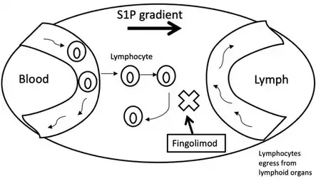 {{cite journal}}: CS1 maint: unflagged free DOI (link) - ↑ Horga A, Montalban X (May 2008). "FTY720 (fingolimod) for relapsing multiple sclerosis". Expert Review of Neurotherapeutics. 8 (5): 699–714. doi:10.1586/14737175.8.5.699. PMID 18457527. S2CID 28071687.