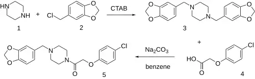 PTC alkylation of piperazine (1) with 2 equivalents of piperonyl chloride [25054-53-9] (2) in the presence of cetrimonium bromide gives 1,4-bis-piperonylpiperazine [55436-41-4] (3). Base catalyzed treatment with 4-Chlorophenoxyacetic acid (4) displaces one of the piperonyl groups to give fipexide (5).