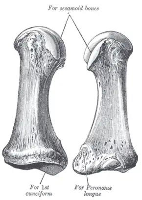 The first metatarsal articulates (forms joints) with the medial cuneiform and to a small extent with the intermediate cuneiform bone.[2] Its proximal articular surface is large and kidney-shaped. Its circumference is grooved, for the tarsometatarsal ligaments, and medially gives insertion to part of the tendon of the tibialis anterior.