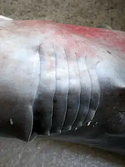 Sharks and rays typically have five pairs of gill slits that open directly to the outside of the body, though some more primitive sharks have six or seven pairs. Adjacent slits are separated by a cartilaginous gill arch from which projects a long sheet-like septum, partly supported by a further piece of cartilage called the gill ray. The individual lamellae of the gills lie on either side of the septum. The base of the arch may also support gill rakers, small projecting elements that help to filter food from the water.[6]