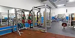 Most health clubs have a main workout area, which primarily consists of free weights including dumbbells and barbells and the stands and benches used with these items and exercise machines, which use gears, cables and other mechanisms to guide the user's exercise. This area often includes mirrors so that exercisers can monitor and maintain correct posture during their workout. A gym that predominantly or exclusively consists of free weights (dumbbells and barbells), as opposed to exercise machines, is sometimes referred to as a black-iron gym, after the traditional color of weight plates.[2]