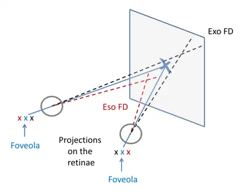 Most observers have a so-called "normal" binocular vision in the sense that they are able to view stereoscopically, but still many of these observers can have a sub-optimal condition in terms of a fixation disparity (FD). The vergence angle is slightly misadjusted so that the fixation point is projected slightly apart from the centre of the fovea. The visual axes may intersect in front (red lines) of the target plane, or behind (black line); these states of over- or under-convergence are referred to as eso- or exo FD, respectively (see Fig.1). In the visual cortex, a binocular disparity between the two retinal images remains. If this disparity is small enough, sensory and neural mechanisms in binocular neurons still attribute the same visual direction to these slightly disparate images and single vision is provided. This mechanism of sensory fusion with normal retinal correspondence operates within a certain limit of disparity, referred to as Panum's area. If the disparity is larger, the normal Panum's fusion mechanism is not sufficient; rather, in order to achieve fusion, a neural remapping of retinal correspondence can occur, which - however - prevents a high quality stereo vision.[7]