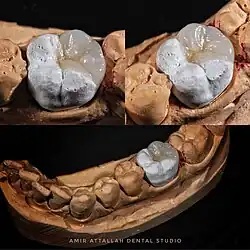 A crown is used to cover a tooth and may be commonly referred to as a "cap." Traditionally, the teeth to be crowned are prepared by a dentist, and records are given to a dental technician to construct the prosthesis. The records include models, which are replicas of a patient's teeth, and the impressions used to make these models. There are many different methods of crown fabrication, each using a different material. Some methods are quite similar and utilize either very similar or identical materials. Crowns may be made of gold or other similar metals, porcelain, or a combination of the two. Crowns made of Zirkonia Oxide are being made more popular due to their high translucency and durability as opposed to the chipping disadvantages of porcelain crowns.