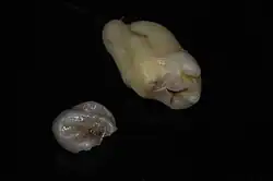 An inlay fitted into the model and ready to be cemented clinically on the natural tooth