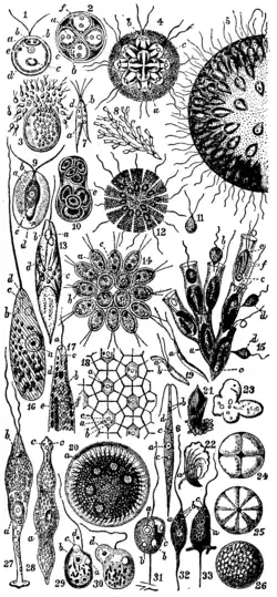 - ↑ Fritsch, F.E. The Structure and Reproduction of the Algae. Vol. I. Introduction, Chlorophyceae. Xanthophyceae, Chrysophyceae, Bacillariophyceae, Cryptophyceae, Dinophyceae, Chloromonadineae, Euglenineae, Colourless Flagellata. 1935. Cambridge, England: Cambridge University Press, .