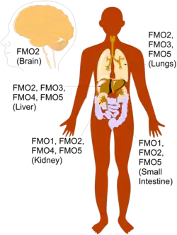 Expression of each type of FMO relies on several factors including, cofactor supply, physiological & environmental factors, as well as diet. Because of these factors, each type of FMO is expressed differently depending on the species and tissue.[30] In humans, expression of FMO's is mainly concentrated to the human liver, lungs, and kidneys, where most of the metabolism of xenobiotics occur. However, FMO's can also be found in the human brain and small intestine. While FMO1-5 can be found in the brain, liver, kidneys, lungs, and small intestine, the distribution of each type of FMO differs depending on the tissue and the developmental stage of the person.[14]