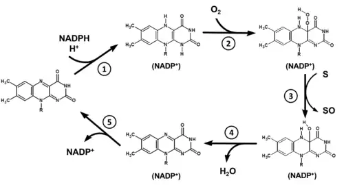 - 1 2 3 van Berkel WJ, Kamerbeek NM, Fraaije MW (August 2006). "Flavoprotein monooxygenases, a diverse class of oxidative biocatalysts". Journal of Biotechnology. 124 (4): 670–89. doi:10.1016/j.jbiotec.2006.03.044. hdl:11370/99a1ac5c-d4a4-4612-90a3-4fe1d4d03a11. PMID 16712999.