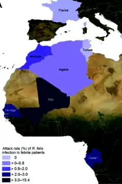 | June 2010–April 2012 Prevalence of Rickettsia felis infection Gabon, Senegal, Mali, Algeria, Morocco, France |