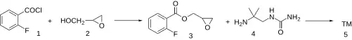 Acylation of acid chloride 2-Fluorobenzoyl chloride [393-52-2] (1) with glycidol (2) produces the ester 2,3-Epoxypropyl 2-Fluorobenzoate [85515-51-1] (3). Reaction of that intermediate with amine (2-Amino-2-methyl-propyl)-urea [87484-83-1] (4) obtained by reaction of 1,1-dimethylethylenediamine with urea, gives flestolol (5).