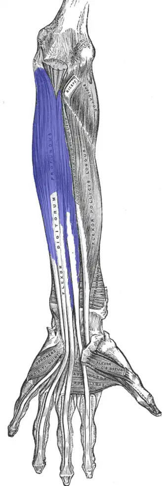 Along with the flexor digitorum superficialis, it has long tendons that run down the arm and through the carpal tunnel and attach to the palmar side of the phalanges of the fingers.[4]