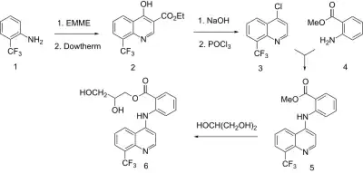 Floctafenine can be synthesized beginning with the conversion of ortho-trifluoromethyl aniline (1) to a quinolol.[2][3][4] The compound is then condensed with ethoxy methylene malonic diethyl ester (EMME) and cyclized thermally (2). That intermediate is then saponified; the resulting acid is decarboxylated and finally converted to the 4-chloroquinoline (3) by reaction with phosphorus oxychloride. The displacement of chlorine with methyl anthranilate (4) then affords the coupled intermediate (5). An ester interchange of that product with glycerol leads to the glyceryl ester, floctafenine (6).