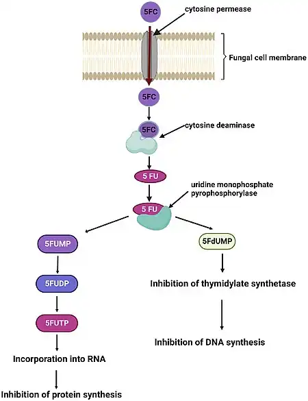 • Flucytosine is intrafungally converted into the cytostatic fluorouracil[11] which undergoes further steps of activation and finally interacts as 5-fluorouridinetriphosphate with RNA biosynthesis thus disturbing the building of certain essential proteins.