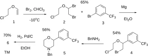 Halogenation of 2-chloroethyl vinyl ether (1) with molecular bromine gives 1,2-dibromo-1-(2-chloroethoxy)ethane (2). Grignard reaction with 3-bromobenzotrifluoride (3) gives 1-[2-bromo-1-(2-chloroethoxy)ethyl]-3-(trifluoromethyl)benzene (4). Treatment with benzylamine gives 4-benzyl-2-[3-(trifluoromethyl) phenyl]morpholine (5). Catalytic hydrogenation strips the benzyl protecting group completing the synthesis of flumexadol (6).